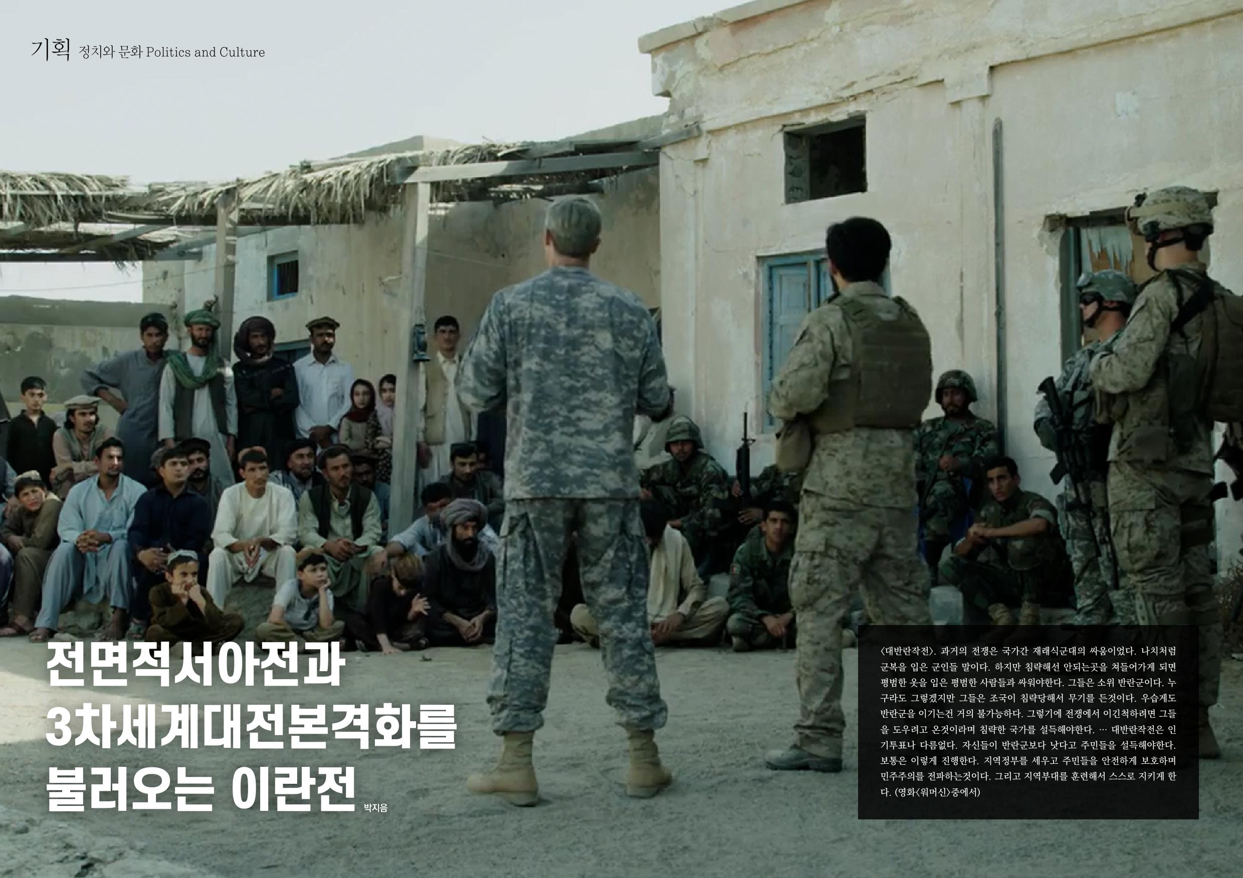 <대반란작전>. 과거의 전쟁은 국가간 재래식군대의 싸움이었다. 나치처럼 군복을 입은 군인들 말이다. 하지만 침략해선 안되는곳을 쳐들어가게 되면 평범한 옷을 입은 평범한 사람들과 싸워야한다. 그들은 소위 반란군이다. 누구라도 그렇겠지만 그들은 조국이 침략당해서 무기를 든것이다. 우습게도 반란군을 이기는건 거의 불가능하다. 그렇기에 전쟁에서 이긴척하려면 그들을 도우려고 온것이라며 침략한 국가를 설득해야한다. … 대반란작전은 인기투표나 다름없다. 자신들이 반란군보다 낫다고 주민들을 설득해야한다. 보통은 이렇게 진행한다. 지역정부를 세우고 주민들을 안전하게 보호하며 민주주의를 전파하는것이다. 그리고 지역부대를 훈련해서 스스로 지키게 한다. (영화<워머신>중에서)