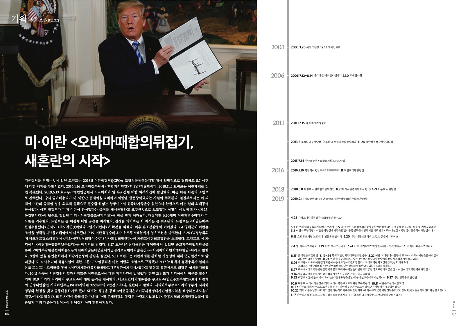 기존질서를 뒤집는것이 일인 트럼프는 2018.5 이란핵협정(JCPOA·포괄적공동행동계획)에서 일방적으로 탈퇴하고 8.7 이란에 대한 제재를 부활시켰다. 2016.1.16 오바마정부당시 <핵합의이행일>후 2년7개월만이다. 2018.11.5 트럼프는 이란제재를 전면 복원했다. 2019.6.13 호르무즈해협인근에서 노르웨이와 일 유조선에 대한 피격사건이 발생했다. 미는 이를 이란의 소행으로 간주했다. 당시 일아베총리가 미·이란간 중재역을 자처하며 이란을 방문중이었다는 사실이 주목된다. 일정부로서는 이 피격이 이란의 공격일 경우 외교적 실책으로 될수밖에 없는 상황이어서 신중하지않을수 없었으나 한편으로 미는 일의 최대동맹국이었다. 이후 일정부가 미에 이란이 관여됐다는 증거를 제시해달라고 요구한것으로 보도됐다. 상황이 이렇게 되자 <제2의통킹만사건>이 될수도 있었던 미의 <이란일유조선피격설>은 힘을 받기 어려웠다. 며칠뒤인 6.20새벽 이란혁명수비대가 미드론을 격추했다. 트럼프는 곧 이란에 대한 공습을 지시했다. 전쟁을 의미하는 이 지시는 곧 취소됐다. 트럼프는 <이란은매우큰실수를했다>면서도 <의도적인것이었다고믿기어렵다>며 확전을 피했다. 이후 유조선갈등이 이어졌다. 7.4 영해군이 이란유조선을 영국령지브롤터해역에서 나포했다. 7.19 이란혁명수비대가 호르무즈해협에서 영유조선을 나포한다. 8.25 G7정상회의에 마크롱프랑스대통령이 <미와이란정상회담이수주내성사되길희망한다>며 자리프이란외교장관을 초대했다. 트럼프도 이 자리에서 <이란대통령을만날수있다>는 메시지를 남겼다. 8.27 로하니이란대통령은 테헤란에서 있었던 순교자추념행사연설을 통해 <미가부당한불법제재를모두해제하지않는다면관계가긍정적으로변하지않을것>·<이것이미가먼저해야할일>이라고 밝혔다. 9월에 있을 유엔총회에서 회담가능성이 관심을 끌었다. 9.11 트럼프는 이란제재를 완화할 가능성에 대해 언급한것으로 알려졌다. 9.14 사우디의 석유시설에 대한 드론·미사일공격을 미는 이란의 소행으로 규정했다. 9.17 뉴욕에서 유엔총회가 열리고 9.18 트럼프는 트위터를 통해 <이란제재를대폭강화하라고재무장관에게지시>했다고 밝혔고 유엔에서도 회담은 성사되지않았다. 10.11 누구에 의한것인지 알려지지않은 이란유조선에 대한 피격사건이 발생했다. 한편 트럼프가 시리아에서 미군을 철수시키자 10.9 터키가 시리아의 쿠르드족에 대한 공격을 개시했다. 에르도안터키대통령은 쿠르드족(인민수호부대YPG)과 아랍계의 민병대연합인 시리아민주군(SDF)지역에 32km폭의 <안전구역>을 원한다고 말했다. 시리아북부쿠르드자치정부가 시리아정부와 협정을 맺고 공동대응하기로 했다. SDF는 성명을 통해 <이번공격은터키군과용병대가진입한지역을 해방하는데도움이될것>이라고 밝혔다. 많은 사건이 불확실한 가운데 아직 문제해결의 동력은 마련되지않고있다. 중동지역의 자체해결능력이 강화될지 미의 대중동개입여론이 강해질지 아직 명확하지않다.