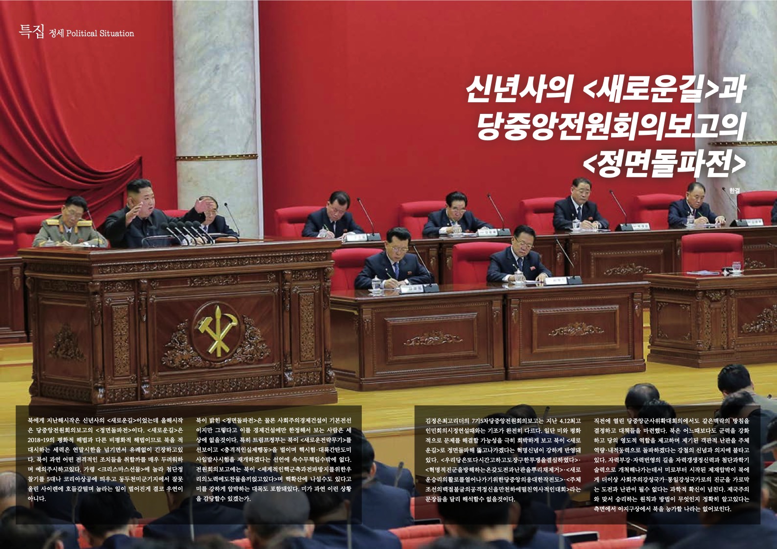 김정은최고리더의 7기5차당중앙전원회의보고는 지난 4.12최고인민회의시정연설때와는 기조가 완전히 다르다. 일단 미와 평화적으로 문제를 해결할 가능성을 극히 희박하게 보고 북이 <새로운길>로 정면돌파해 뚫고나가겠다는 혁명신념이 강하게 반영돼있다. <우리당은또다시간고하고도장구한투쟁을결심하였다>· <혁명적진군을방해하는온갖도전과난관을뿌리채제거>·<새로운승리의활로를열어나가기위한당중앙의웅대한작전도>·<주체조선의백절불굴의공격정신을만천하에떨친역사적인대회>라는 문장들을 달리 해석할수 없을것이다.