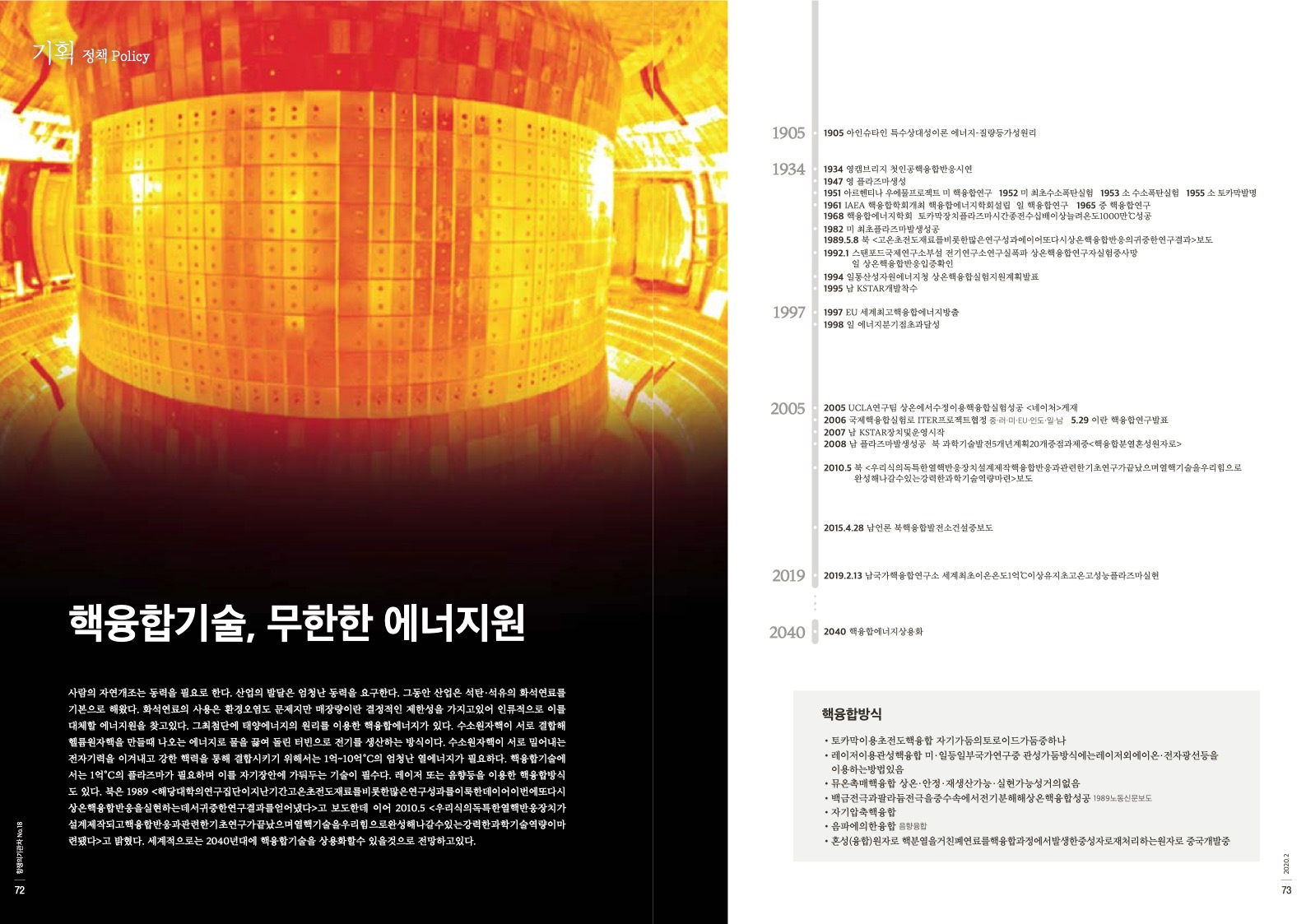 사람의 자연개조는 동력을 필요로 한다. 산업의 발달은 엄청난 동력을 요구한다. 그동안 산업은 석탄·석유의 화석연료를 기본으로 해왔다. 화석연료의 사용은 환경오염도 문제지만 매장량이란 결정적인 제한성을 가지고있어 인류적으로 이를 대체할 에너지원을 찾고있다. 그최첨단에 태양에너지의 원리를 이용한 핵융합에너지가 있다. 수소원자핵이 서로 결합해 헬륨원자핵을 만들때 나오는 에너지로 물을 끓여 돌린 터빈으로 전기를 생산하는 방식이다. 수소원자핵이 서로 밀어내는 전자기력을 이겨내고 강한 핵력을 통해 결합시키기 위해서는 1억~10억°C의 엄청난 열에너지가 필요하다. 핵융합기술에 서는 1억°C의 플라즈마가 필요하며 이를 자기장안에 가둬두는 기술이 필수다. 레이저 또는 음향등을 이용한 핵융합방식 도 있다. 북은 1989 <해당대학의연구집단이지난기간고온초전도재료를비롯한많은연구성과를이룩한데이어이번에또다시 상온핵융합반응을실현하는데서귀중한연구결과를얻어냈다>고 보도한데 이어 2010.5 <우리식의독특한열핵반응장치가 설계제작되고핵융합반응과관련한기초연구가끝났으며열핵기술을우리힘으로완성해나갈수있는강력한과학기술역량이마 련됐다>고 밝혔다. 세계적으로는 2040년대에 핵융합기술을 상용화할수 있을것으로 전망하고있다.