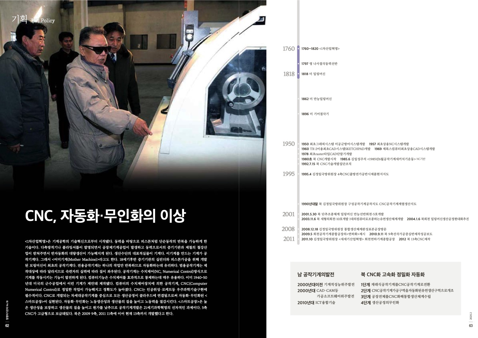 <1차산업혁명>은 기계공학의 기술혁신으로부터 시작됐다. 동력을 바탕으로 피스톤처럼 단순동작의 반복을 가능하게 한 기술이다. 다축방적기나 플라잉셔틀이 발명되면서 공장제기계공업이 발생하고 동력으로서의 증기기관과 제철의 철강산 업이 받쳐주면서 반자동화의 대량생산이 가능해지게 된다. 생산수단의 대표적실물이 기계다. 이기계를 만드는 기계가 공 작기계다. 그래서 <어미기계(Mother Machine)>라고도 한다. 18세기후반 증기기관의 실린더와 피스톤가공을 위해 개발 된 보링머신이 최초의 공작기계다. 전용공작기계는 하나의 작업만 반복하므로 자동화하는데 유리하다. 범용공작기계는 제 작대상에 따라 달라지므로 숙련자의 실력에 따라 질이 좌우된다. 공작기계는 수치제어(NC, Numerical Control)방식으로 기계를 작동시키는 기능이 발전하게 된다. 컴퓨터기능은 수치제어를 효과적으로 통제하는데 매우 유용하다. 이미 1940~50 년대 미국의 군수공업에서 이런 기계가 제안돼 제작됐다. 컴퓨터의 수치제어장치에 의한 공작기계, CNC(Computer Numerical Control)로 정밀한 작업이 가능해지고 정확도가 높아졌다. CNC는 인공위성·로케트등 우주과학기술구현에 필수적이다. CNC로 개발되는 차세대공작기계를 중심으로 모든 생산공정이 클라우드에 연결됨으로써 자동화·무인화된 < 스마트공장>이 실현된다. 자동화·무인화는 노동생산성과 생산물의 질을 높이고 노동력을 절감시킨다. <스마트공장>은 높 은 생산성을 보장하고 생산물의 질을 높이고 원가를 낮추므로 공작기계개발은 21세기과학혁명의 선차적인 과제이다. 5축 CNC가 고급형으로 보급돼있다. 북은 2009 9축, 2011 11축에 이어 현재 13축까지 개발했다고 한다.