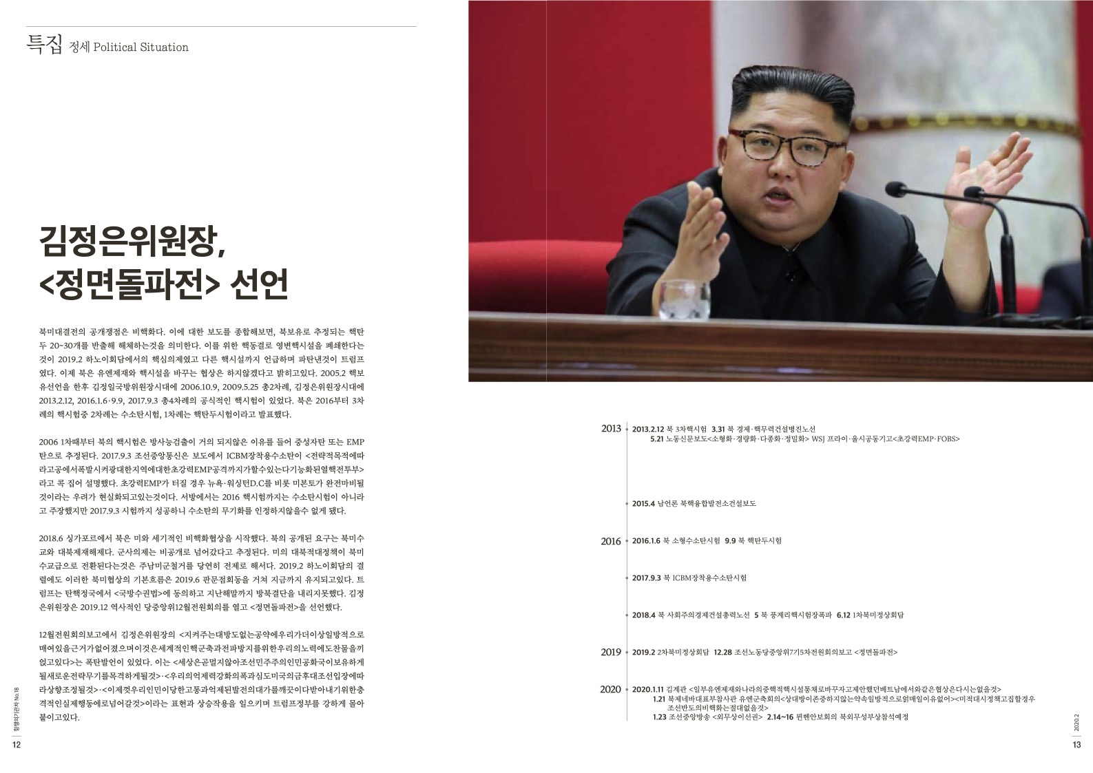 12월전원회의보고에서 김정은위원장의 <지켜주는대방도없는공약에우리가더이상일방적으로 매여있을근거가없어졌으며이것은세계적인핵군축과전파방지를위한우리의노력에도찬물을끼 얹고있다>는 폭탄발언이 있었다. 이는 <세상은곧멀지않아조선민주주의인민공화국이보유하게 될새로운전략무기를목격하게될것>·<우리의억제력강화의폭과심도미국의금후대조선입장에따 라상향조정될것>·<이제껏우리인민이당한고통과억제된발전의대가를깨끗이다받아내기위한충 격적인실제행동에로넘어갈것>이라는 표현과 상승작용을 일으키며 트럼프정부를 강하게 몰아 붙이고있다.