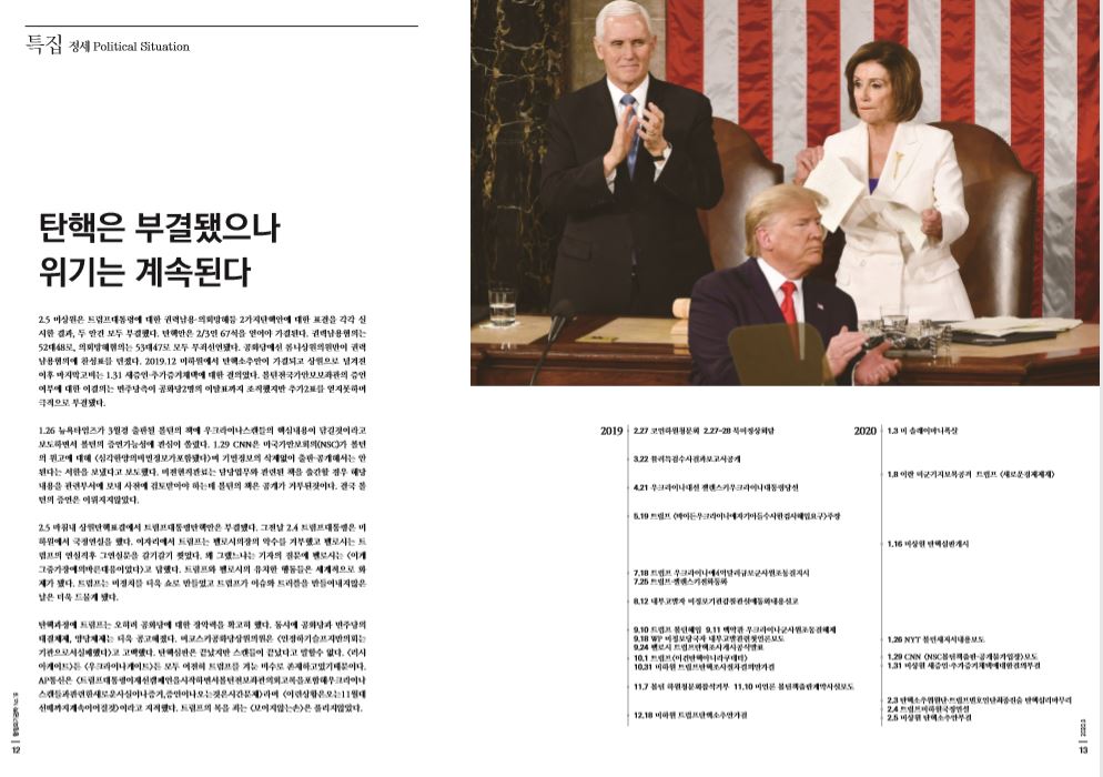 2.5 마침내 상원탄핵표결에서 트럼프대통령탄핵안은 부결됐다. 그전날 2.4 트럼프대통령은 미하원에서 국정연설을 했다. 이자리에서 트럼프는 펠로시의장의 악수를 거부했고 펠로시는 트럼프의 연설직후 그연설문을 갈기갈기 찢었다. 왜 그랬느냐는 기자의 질문에 펠로시는 <이게그중가장예의바른대응이었다>고 답했다. 트럼프와 펠로시의 유치한 행동들은 세계적으로 화제가 됐다. 트럼프는 미정치를 더욱 쇼로 만들었고 트럼프가 이슈와 트러블을 만들어내지않은 날은 더욱 드물게 됐다.