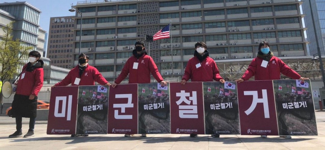민중민주당(환수복지당)은 14일 미대사관앞에서 <내정간섭망언 해리스추방! 북침전쟁책동 트럼프규탄! 미군철거!>촉구 평화시위를 1365일째 진행했다.