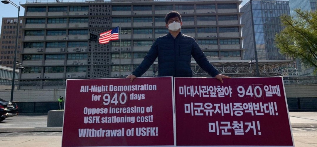 민중민주당(환수복지당)은 23일 미대사관앞에서 <내정간섭망언 해리스추방! 북침전쟁책동 트럼프규탄! 미군철거!>촉구 평화시위를 1374일째 진행했다.