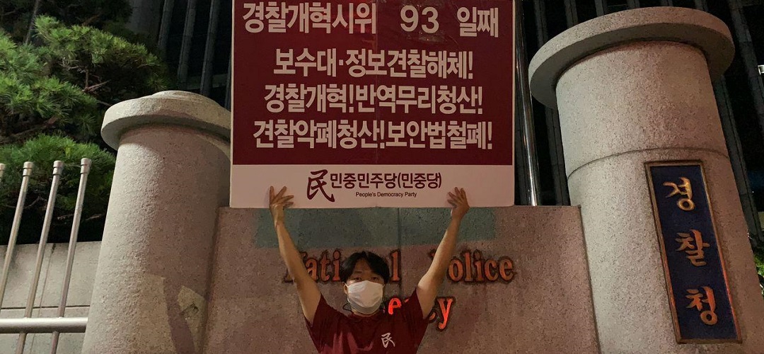 이날 민중민주당은 정보원앞 <프락치공작 책임자처벌!>·<정당탄압 국가정보원해체!>·<파쇼악법 국가보안법철폐!> 일인시위를 94일째 전개했다.